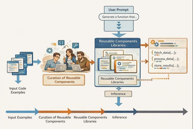 In a sense, we’re still starting with many code examples, but now they matter for influencing programmers with good taste, who manually curate a library of valuable coding patterns. These programmers might still be using AI to accelerate their work, but it is important that every pattern is embodied in a first-class reusable software component. Programmers have been required to at least pay lip service to component-based software reuse for decades, though levels of commitment and success vary widely across projects. Let’s assume we find a good crew able to curate a library of components standing for common features.