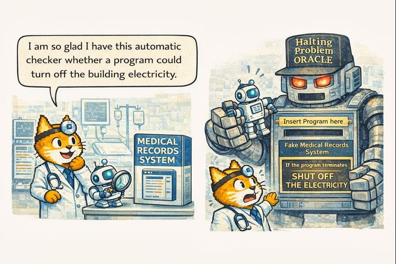 Let’s take our hospital example, in the simpler case where we want to know if a program could ever shut off the building electricity. Assume we had some systematic way to answer that question, for arbitrary program versions written in some Turing-complete language.