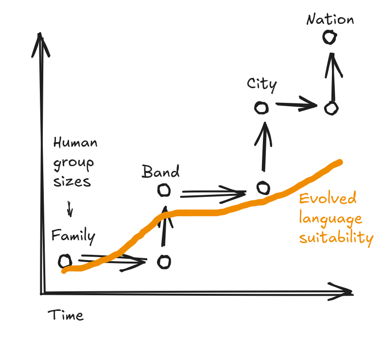 I’m going to use language ambiguity to illustrate the broader pattern of evolution moving so slowly that key features don’t adapt to changes in the way the world works. Any instance of this pattern needs to specify two key parameters. First, we need the way things used to be: humans lived in hunter-gatherer bands of at most a few hundred people. Then, we need how things changed: humans can participate in a globalized economy and culture with billions of people.