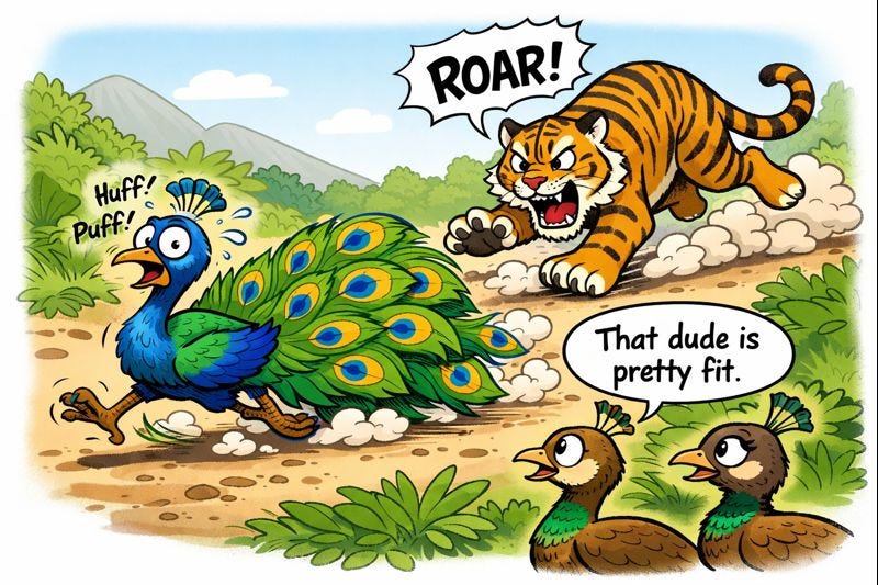 The classic example of signaling is the peacock’s tail. These male birds develop elaborate tails that really interfere with their daily business of survival. The idea behind (evolutionary) signaling is that getting in the way is the point: the peacock with the most over-the-top tail sends the strongest signal to the peahen (his female counterpart) that he is really good at survival. The peahens probably don’t have the cognitive capacity to go through that reasoning deliberately. However, in the distant evolutionary past, it turned out that a good heuristic for identifying prime mates was noticing tails of certain shapes and sizes (modest by today’s standards). Once this preference existed, runaway selection could amplify the extremity of the trait through sexual selection, where animals that manage to appeal more to potential mates reproduce more, and thus their genes spread through populations.
